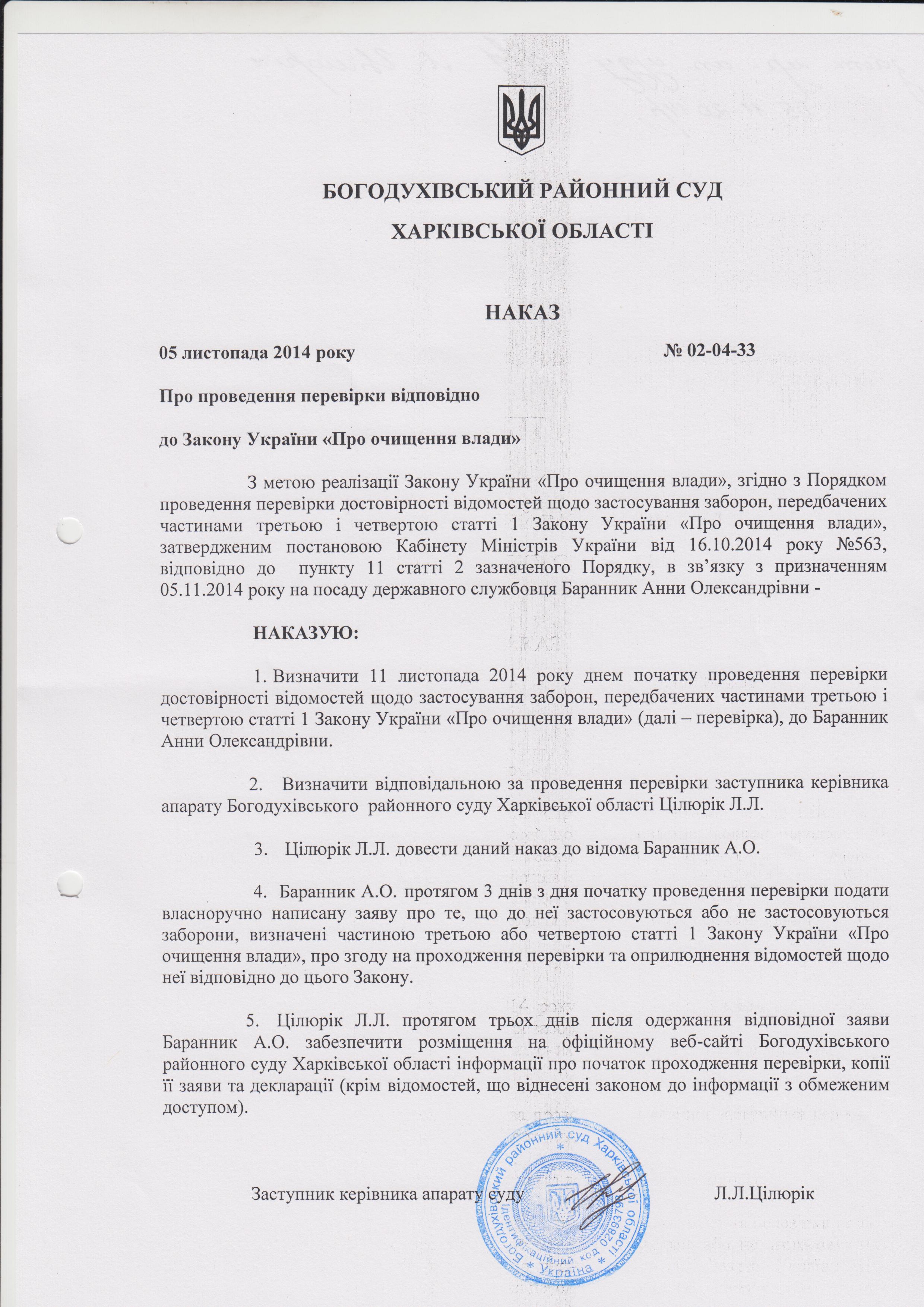 Початок проведення перевірки достовірності відомостей щодо застосування заборон, передбачених частиною третьою і четвертою статті один Закону України Про очищення влади до Баранник А.О.