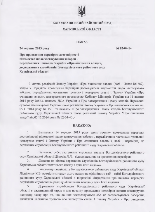 про проведення перевірки достовірності відомостей щодо застосування заборон, передбачених ЗУ "Про очищення влади " до державних службовців Богодухівського районного суду