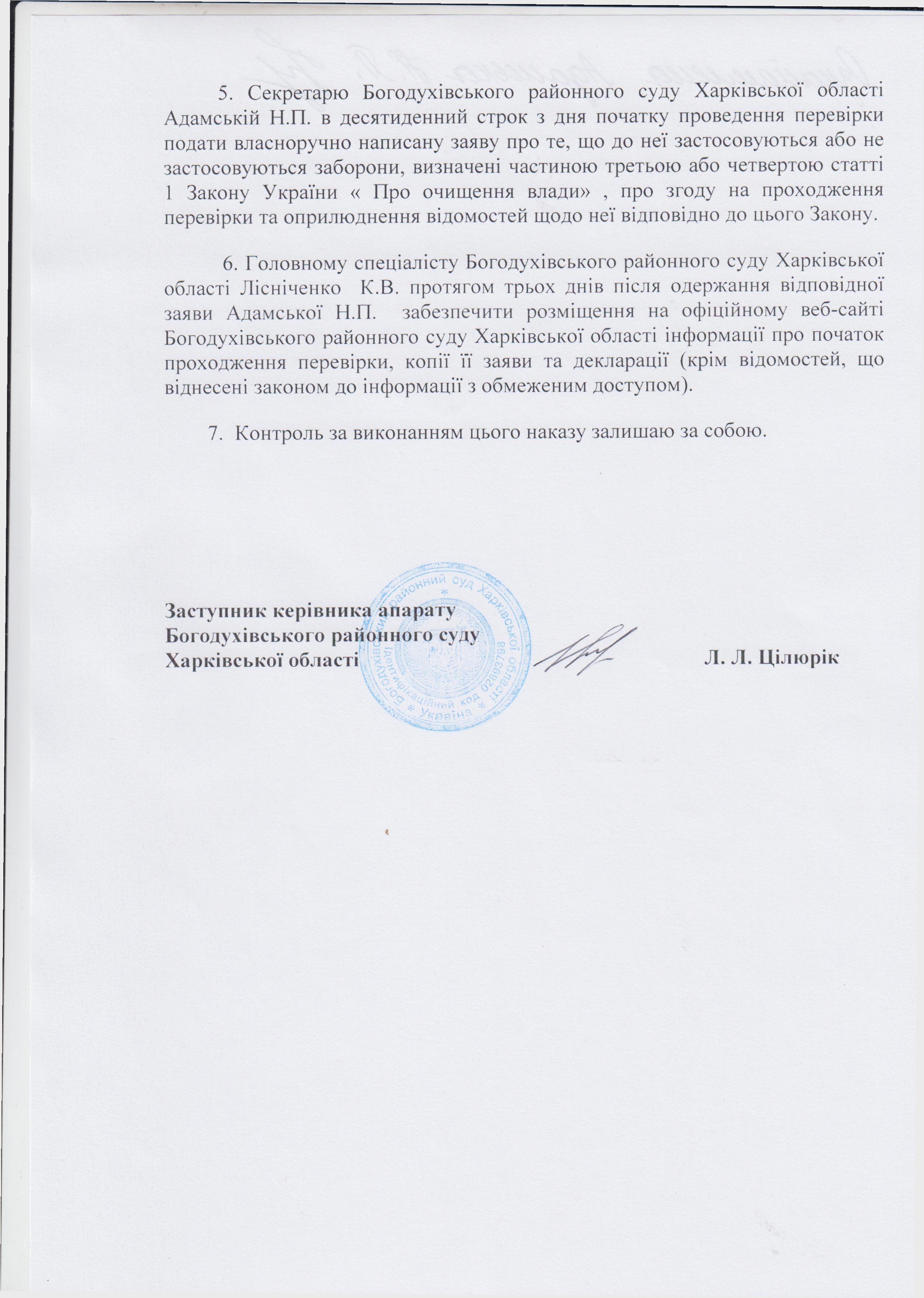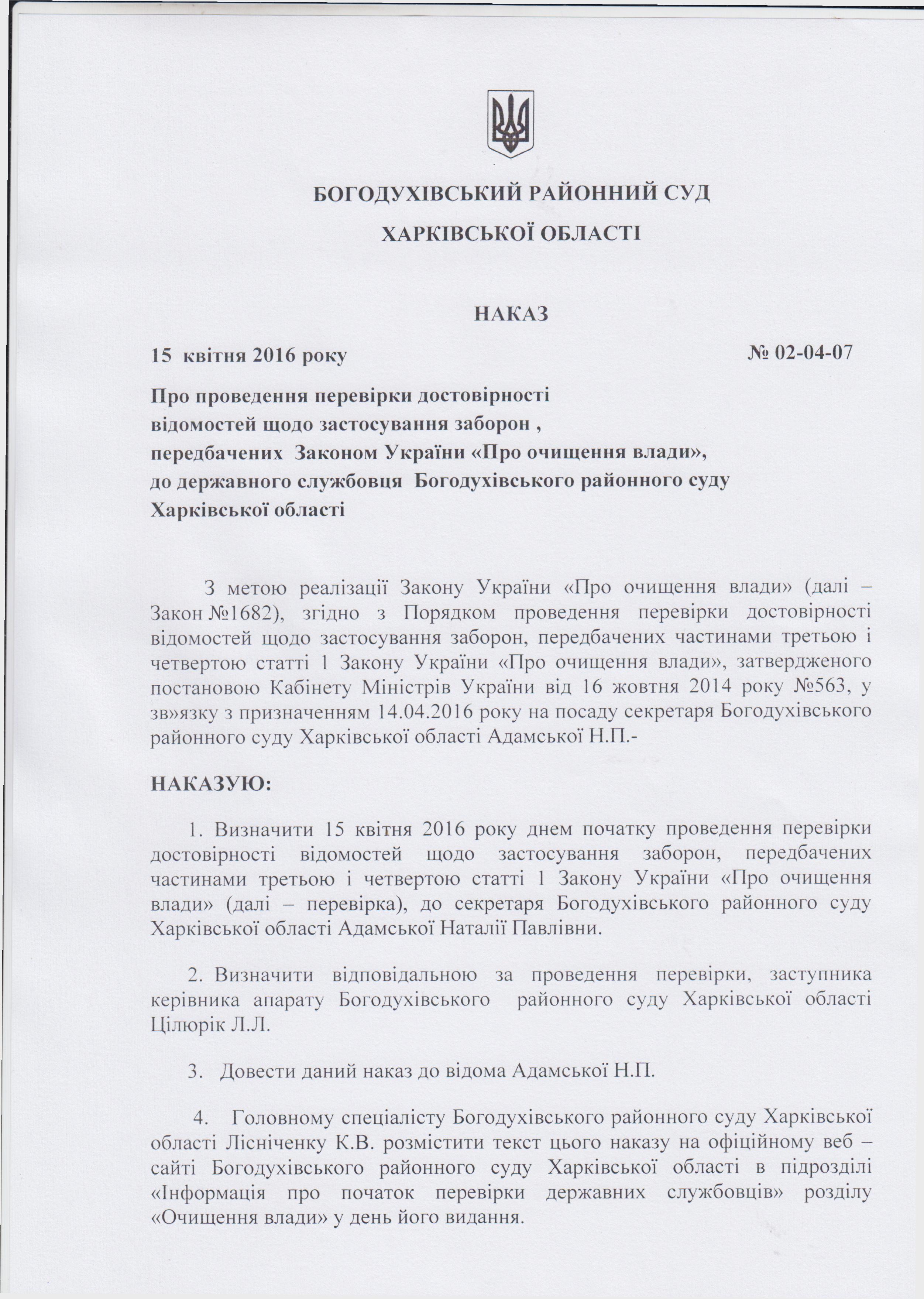 Початок проведення перевірки достовірності відомостей щодо застосування заборон, передбачених частиною третьою і четвертою статті один Закону України Про очищення влади до Адамської Н.П.