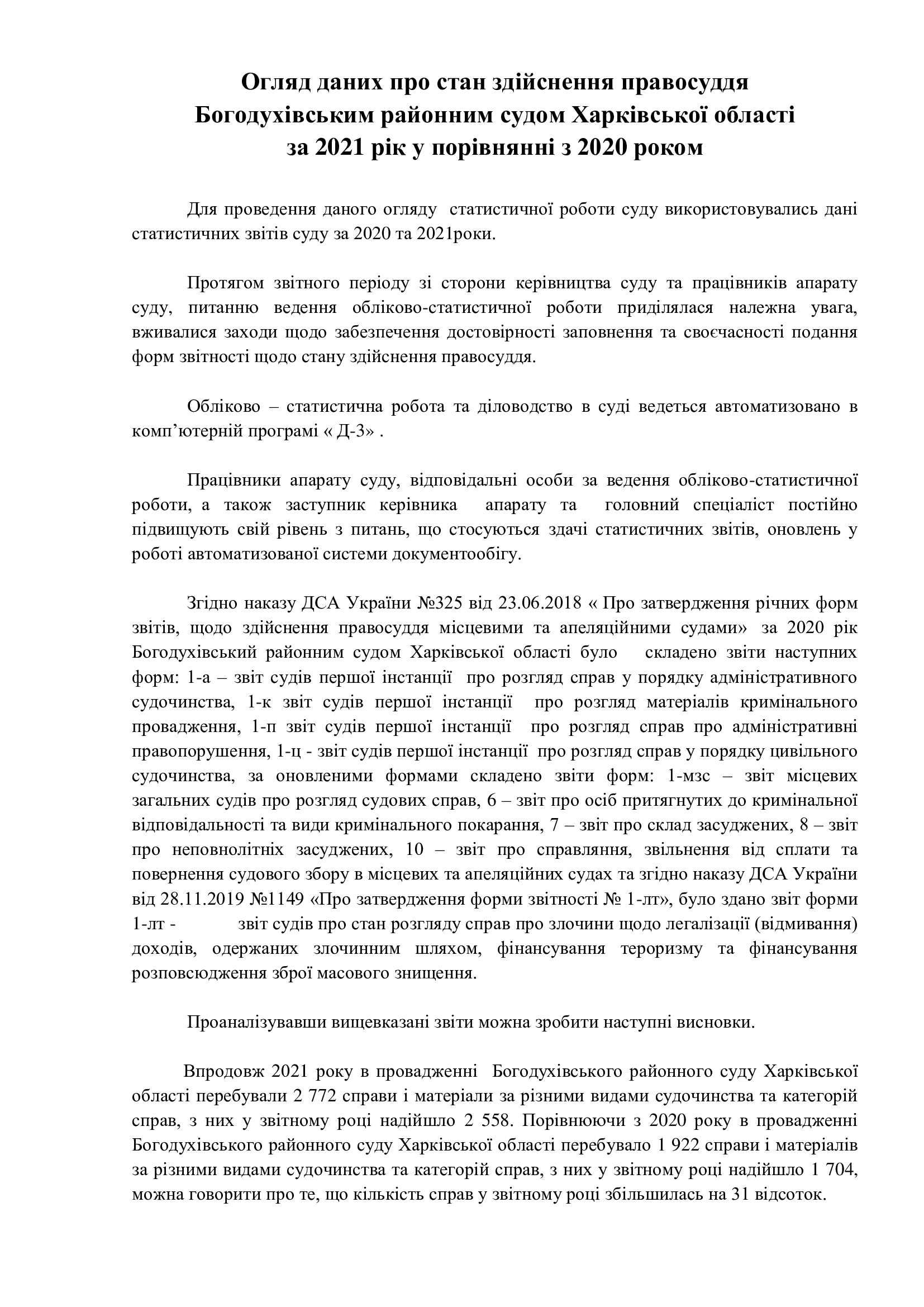 Огляд даних про стан здійснення правосуддя Богодухівським районним судом Харківської області за 2021 рік у порівнянні з 2020 роком